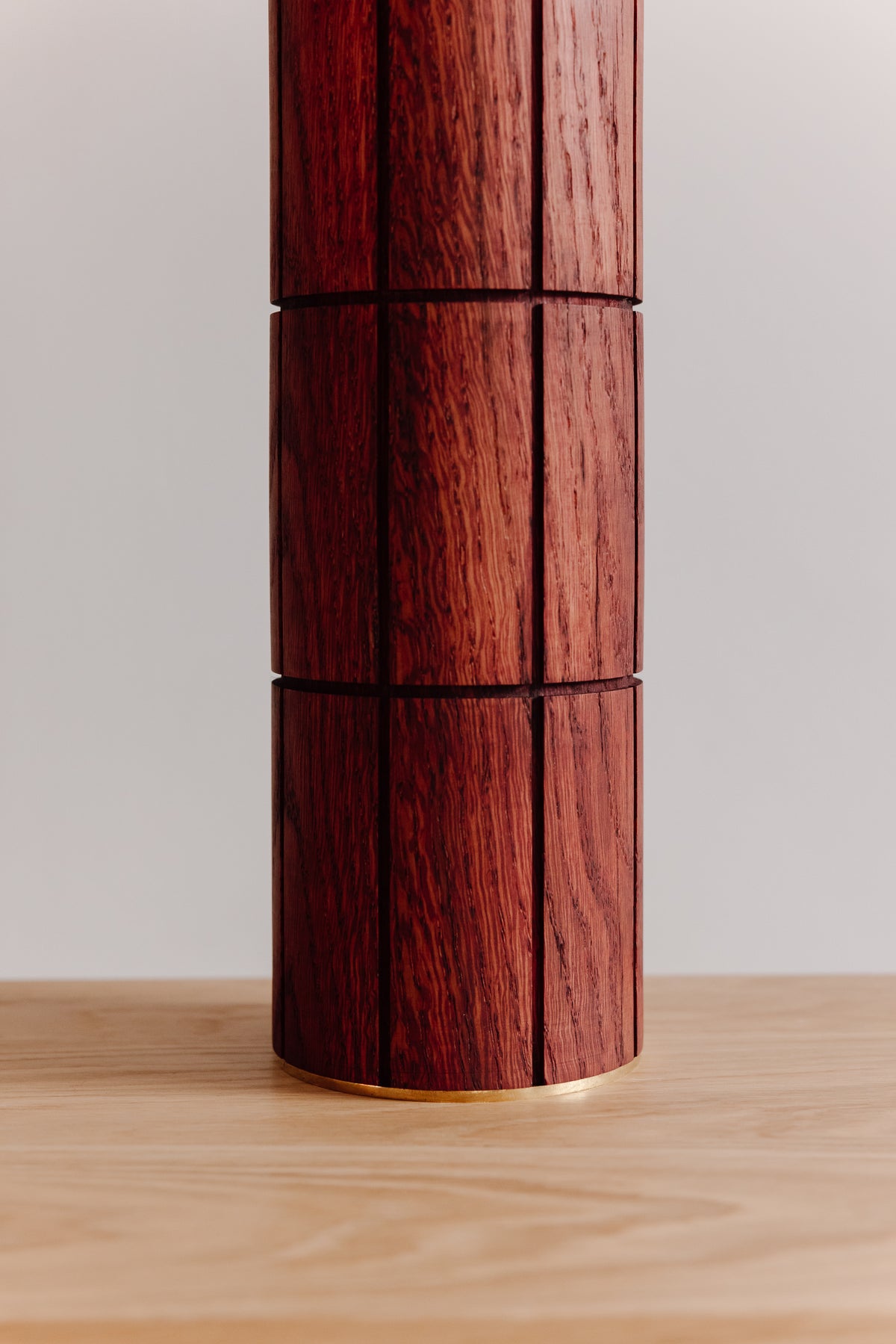 The Coalescere Side Table has four of these hand turned legs, with a solid timber top, finished with burnt orange suede. Available with a round or rectangular top. Well placed sofa or bedside.